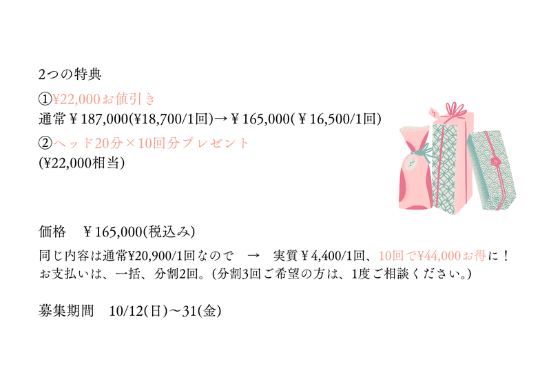 A.推奨しているペースで全トリートメントを受けられなくても、お申込みいただけます。